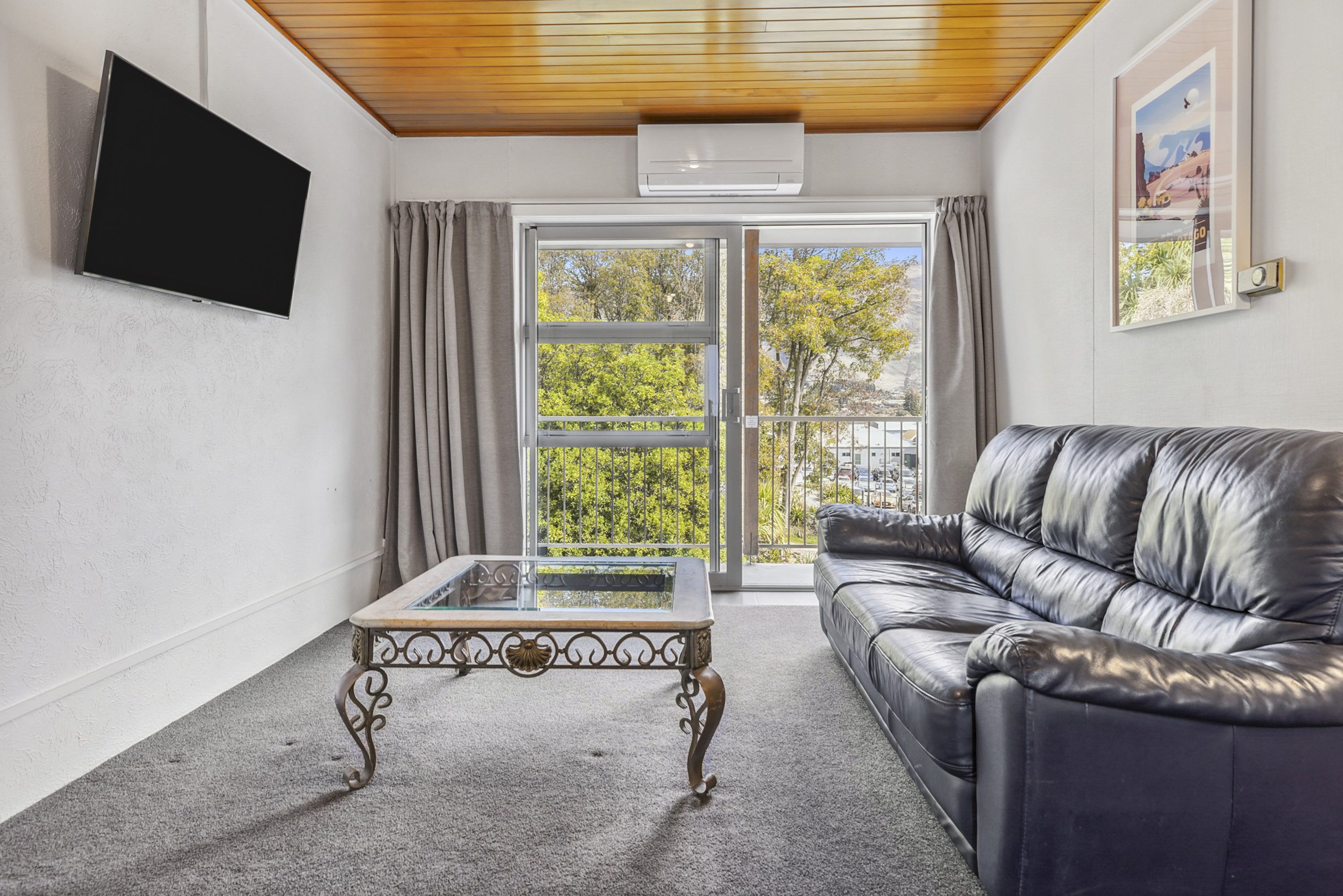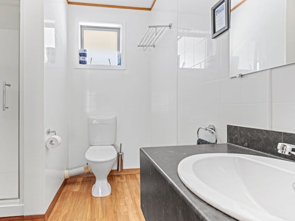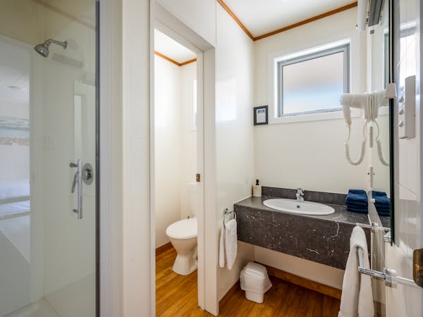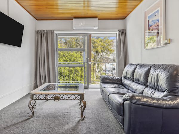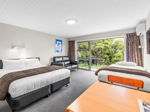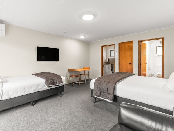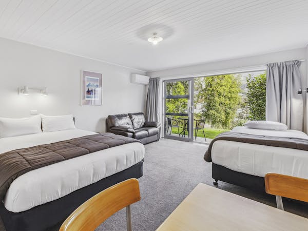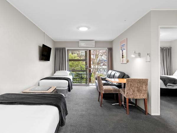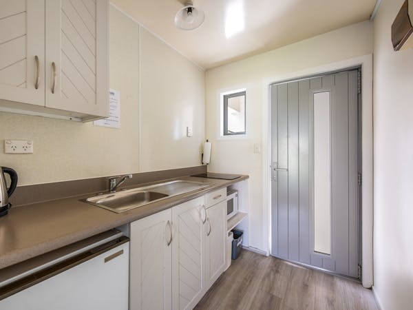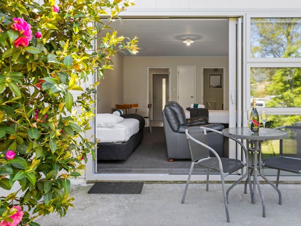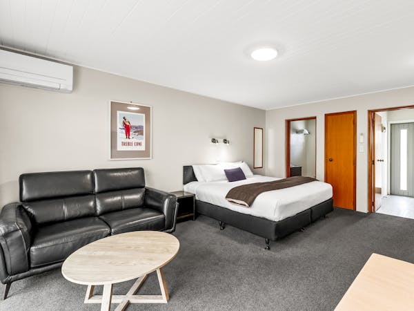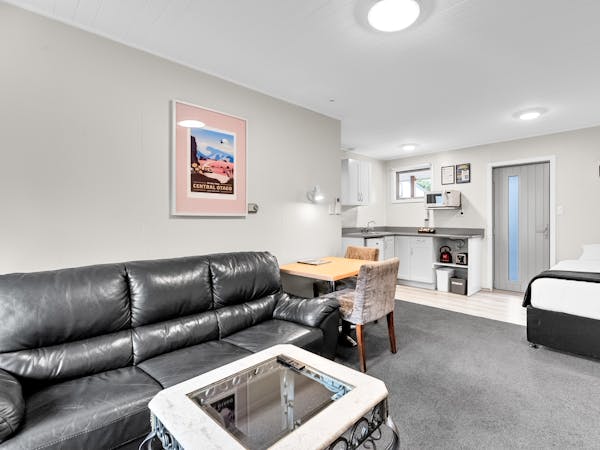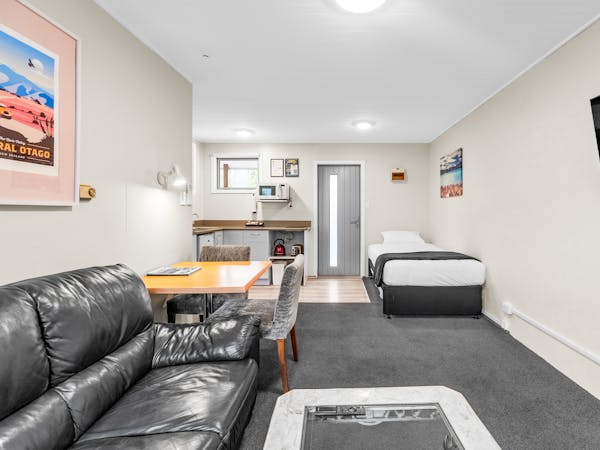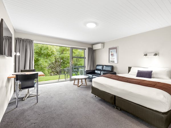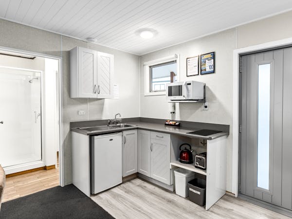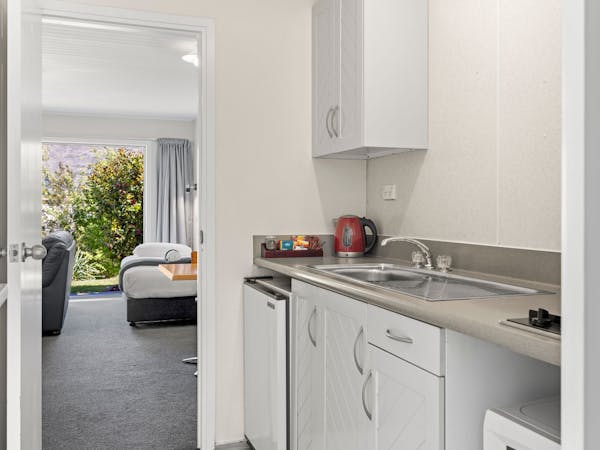 Our spacious deluxe studio features a fully equipped kitchenette with a refrigerator, cooktop, kettle, and microwave along with cutlery, pots, and pans. All rooms have heat pumps and air conditioning.