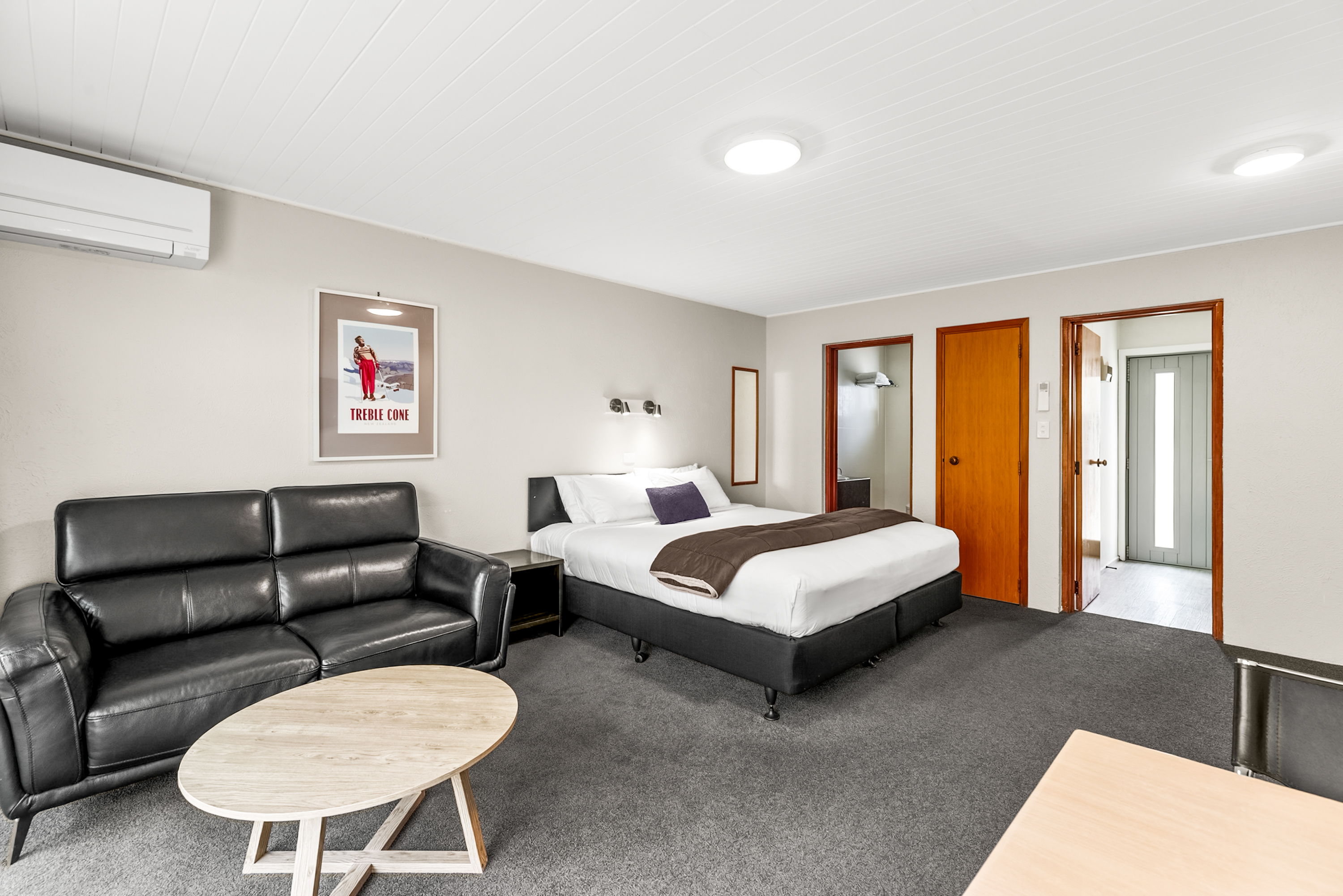 Our spacious deluxe studio features a fully equipped kitchenette with a refrigerator, cooktop, kettle, and microwave along with cutlery, pots, and pans. All rooms have heat pumps and air conditioning.